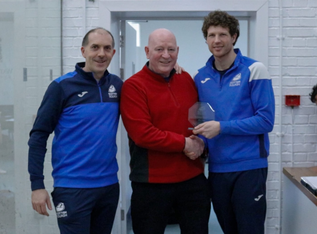 Scottish Squash is to delighted to announce that Jim Hay has been awarded the Services to Squash Award. This prestigious accolade, awarded to individuals who have made an exceptional contribution to squash in Scotland, was presented by Paul Macari, CEO and Paul Bell, Head of Performance & Pathway to Jim at the recent Watsonian Senior Gold tournament held at Myreside.